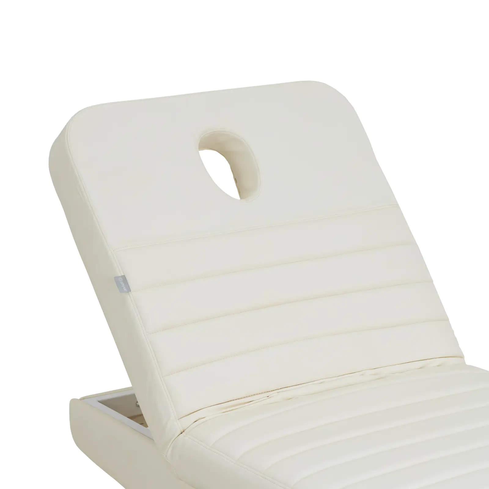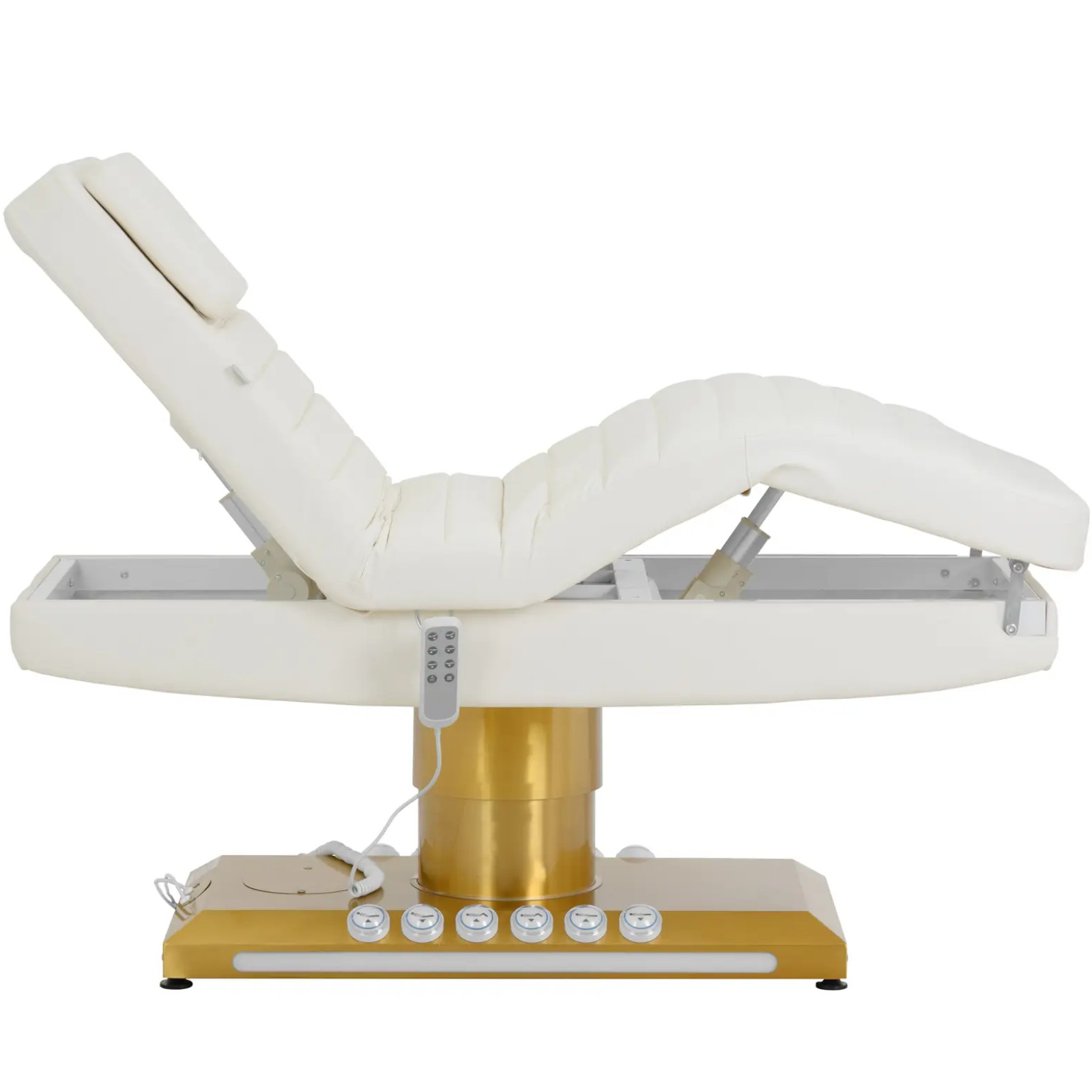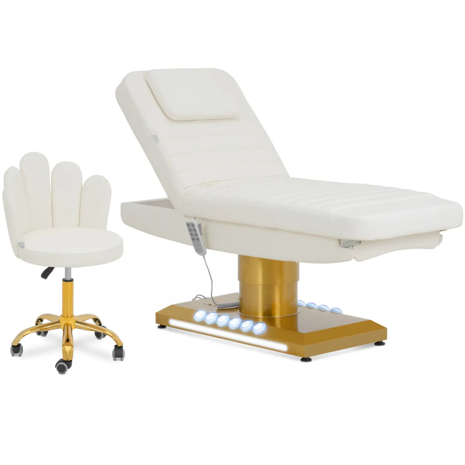 Elektryczny fotel kosmetyczny PHYSA SAVONA WHITE oprócz ekskluzywnego designu zapewni maksymalny relaks w pozycji leżącej lub siedzącej. Pozwoli to na wygodne przeprowadzanie zabiegów kosmetycznych, którymi klienci i klientki będą się w pełni cieszyć. Oczywiście fotel nadaje się również do użytku w studiach stylizacji, tatuażu i piercingu, a także w ośrodkach SPA i odnowy biologicznej. Ponadto w zestawie dostarczane jest krzesło kosmetyczne na kółkach dla jeszcze większego relaksu. Wygodnie można przestawić je w dowolne miejsce za sprawą pięciu lekkobieżnych kółek. Wysokość siedziska ustawia się za pomocą sprężyny gazowej, aby móc przyjąć komfortową pozycję. Jeśli chodzi o wygodę i ergonomię, podgrzewany fotel kosmetyczny jest wyposażony w liczne funkcje, które ustawia się dzięki trzem niezależnym silnikom. Wysokość można zmienić w zakresie 61,5 – 81,5 cm. Minimalna wysokość ułatwi klientom siedzenie. Za pomocą podświetlanej konsoli kontrolera nożnego można określić też kąt oparcia w zakresie od 0 do 62° oraz kąt podnóżka od -10 do 16°, aby dopasować je do danego zabiegu. Wgłębienie na twarz w obszarze głowy pozwoli klientowi swobodnie oddychać nawet w pozycji leżącej, a leżankę kosmetyczną można przekształcić w łóżko do masażu. Miękka tapicerka w połączeniu z najwyższej klasy wodoodpornym i olejoodpornym pokryciem ze skóry syntetycznej, którą można łatwo wyczyścić, zapewnia wysoki komfort i nienaganną higienę. Dzięki solidnej konstrukcji, podstawie o wymiarach 50 x 81 cm wykonanej ze stali węglowej i wysokiej jakości materiałom łóżko kosmetyczne physa ma maksymalny udźwig 200 kg. Sprzęt zachwyca niezwykłą trwałością oraz wyjątkowym i klasycznym designem w kolorze białym ze złotymi elementami.
