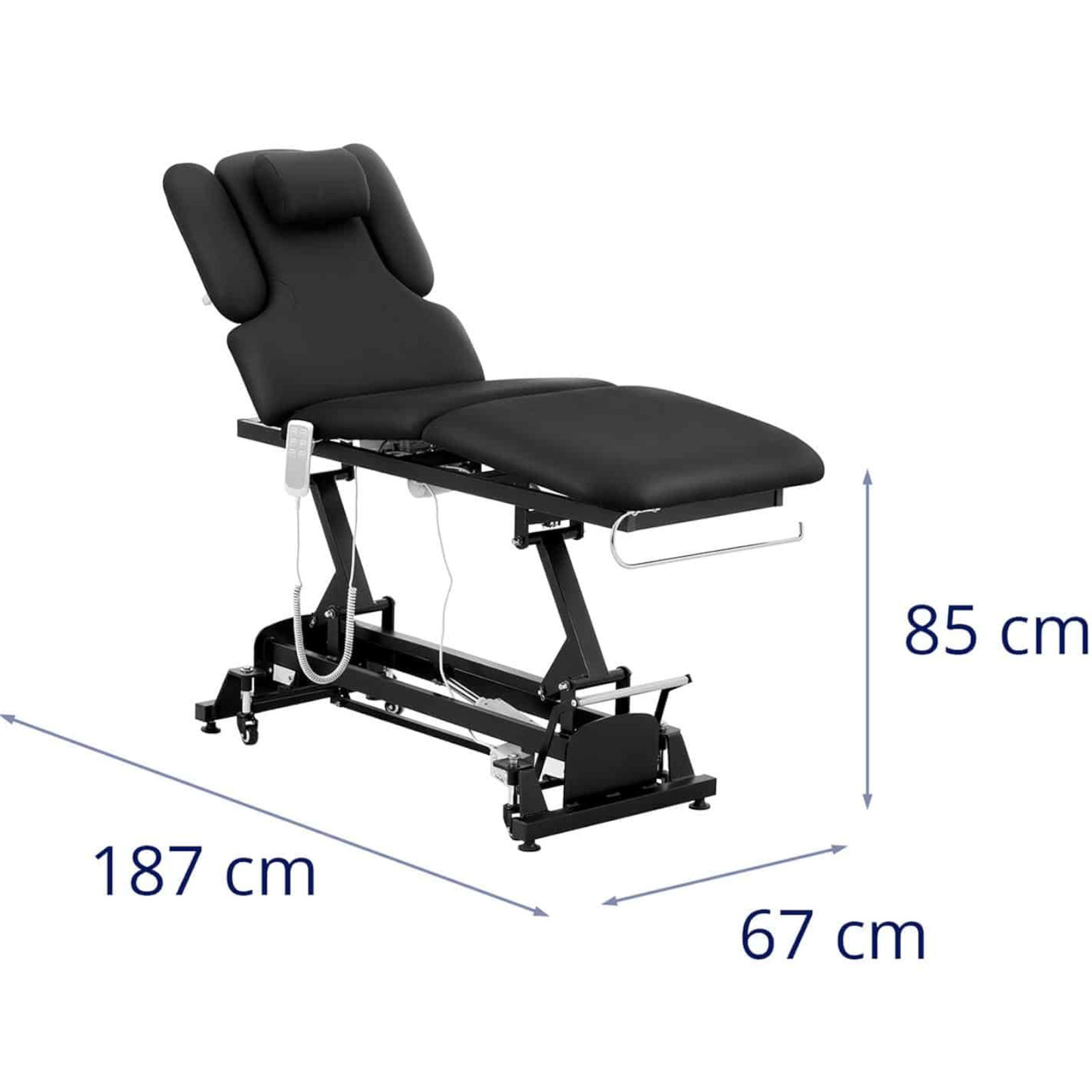 Łóżko do masażu marki Physa sprawdzi się w gabinecie i studio masażu oraz w obiektach SPA & Wellness. Przyda się fizjoterapeutom, masażystom czy kosmetyczkom. Łóżko posiada bardzo solidną konstrukcję. Zostało wyposażone w pilot zdalnego sterowania oraz uchwyt na rolkę papieru. Stół do masażu posiada trzy silniki o łącznej mocy 68 W. Regulują one wysokość mebla w zakresie 640-868 mm, a także kąt oparcia (55°). Zmienić można też kąt siedziska, dzięki czemu zawsze znajdziesz najlepsze ułożenie dla swoich klientów. Zagłówek posiada zdejmowaną poduszkę. Różne grubości piankowego wypełnienia (60-80 mm) zapewniają wygodę i gwarantuje komfort podczas trwania zabiegu. Skóra syntetyczna sprawia, że stół do masażu można szybko i łatwo wyczyścić, nie wchłania on płynów ani kurzu. Solidna konstrukcja wykonana została ze stali malowanej proszkowo. Nośność mebla wynosi 250 kg. 4 koła umożliwiają łatwe przesuwanie łóżka.