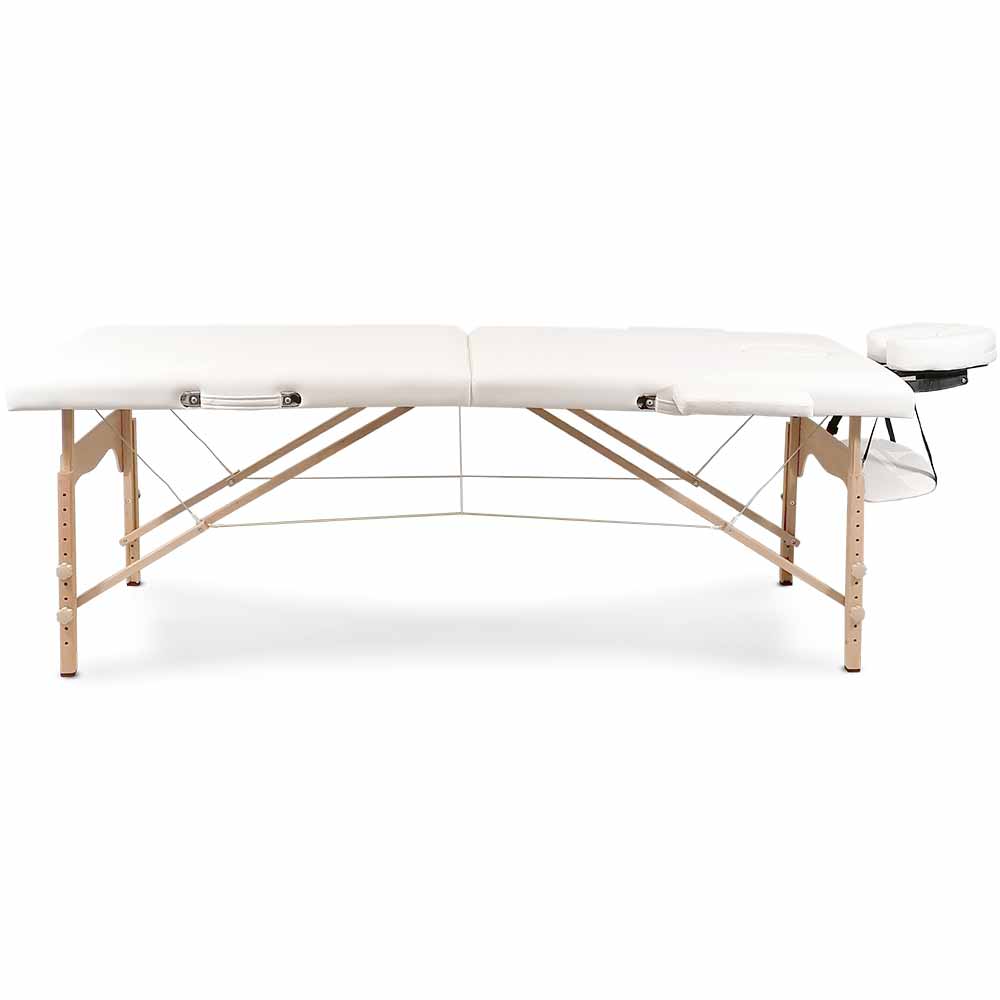 Stabilny stelaż wykonany jest z wysokiej jakości lakierowanego drewna bukowego. Wypełnienie stołu stanowi miękka pianka. Całość obita jest przyjemną w dotyku ekoskórą w kolorze ecru, która jest trwała, łatwa w utrzymaniu czystości oraz odporna na wybrane środki do dezynfekcji (niezawierające nafty, alkoholu, amoniaku, stosowanie środków żrących może spowodować przebarwienia i przetarcia).