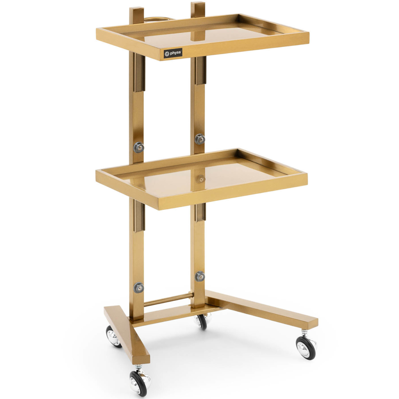 Wózek marki Physa sprawdzi się w salonie kosmetycznym, fryzjerskim a także w prywatnej łazience do utrzymywania w porządku kosmetyków, środków czystości czy innych podręcznych akcesoriów. Może zostać użyty także w kuchni czy jako stolik nocny w sypialni. Wózek posiada 4 płynnie poruszające się kółka. 2 półki z obrzeżami zapewniają wystarczającą ilość miejsca na podręczne przybory oraz chronią przedmioty przed upadkiem. Nośność pomocnika wynosi 10 kg. Rama wózka wykonana została ze stali nierdzewnej, jest odporna na czynniki zewnętrzne, wytrzymała i stabilna. Złoty kolor doda gracji każdemu pomieszczeniu.